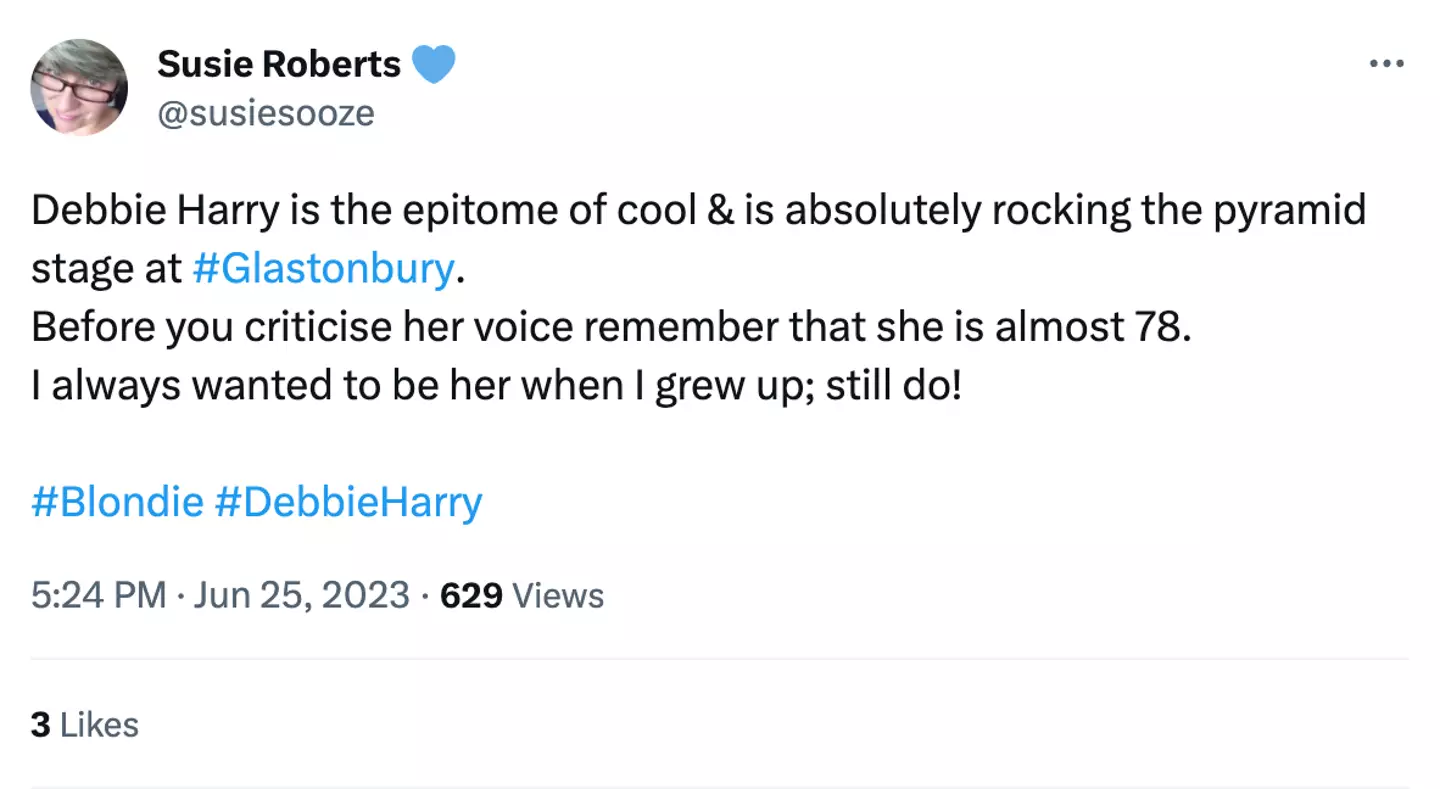 "Debbie Harry is the epitome of cool & is absolutely rocking the pyramid stage at #Glastonbury. Before you criticise her voice remember that she is almost 78," one fan wrote. "I always wanted to be her when I grew up; still do!"