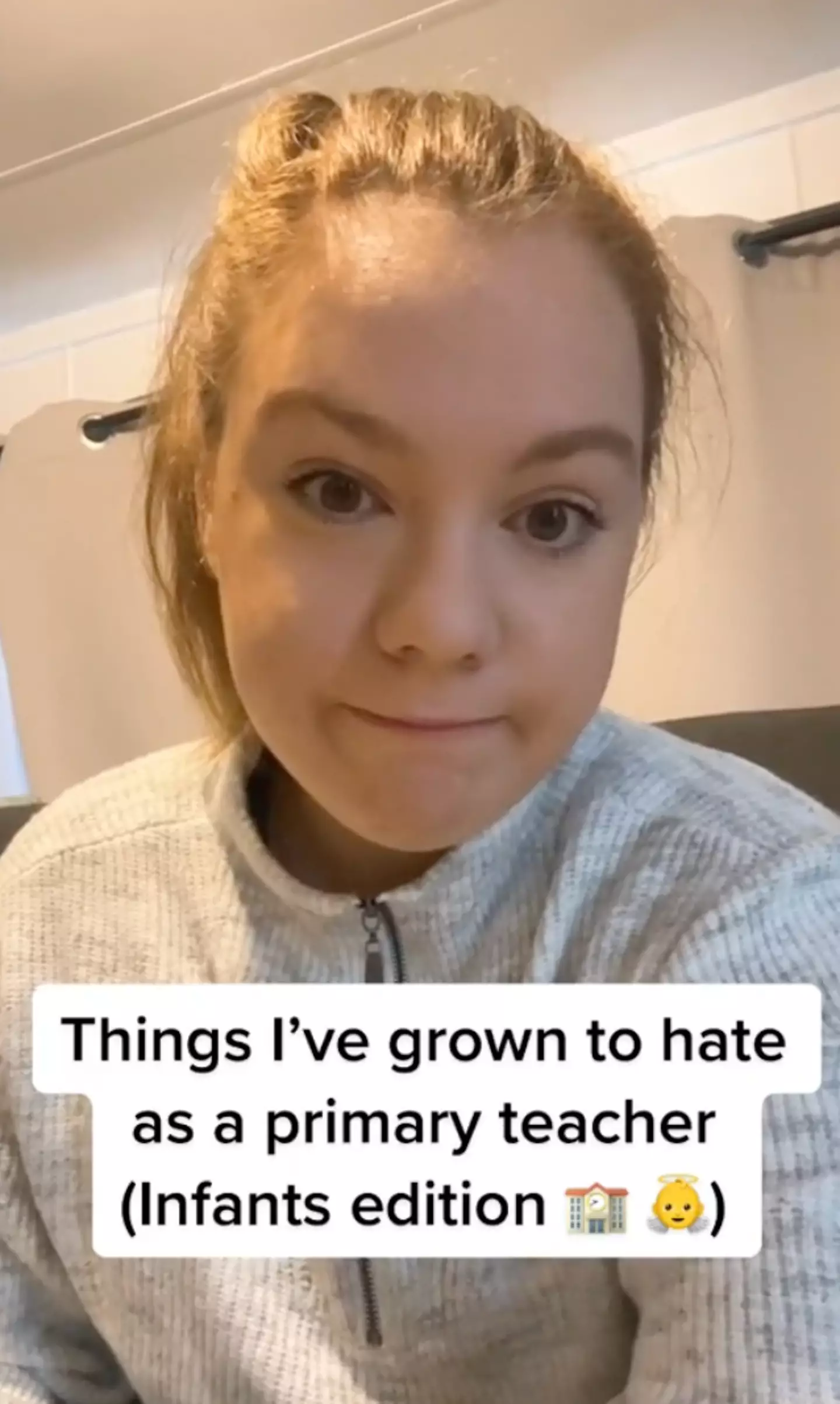 She started off the video with the overlay text reading: "Things I've grown to hate as a primary school teacher (infants edition)."