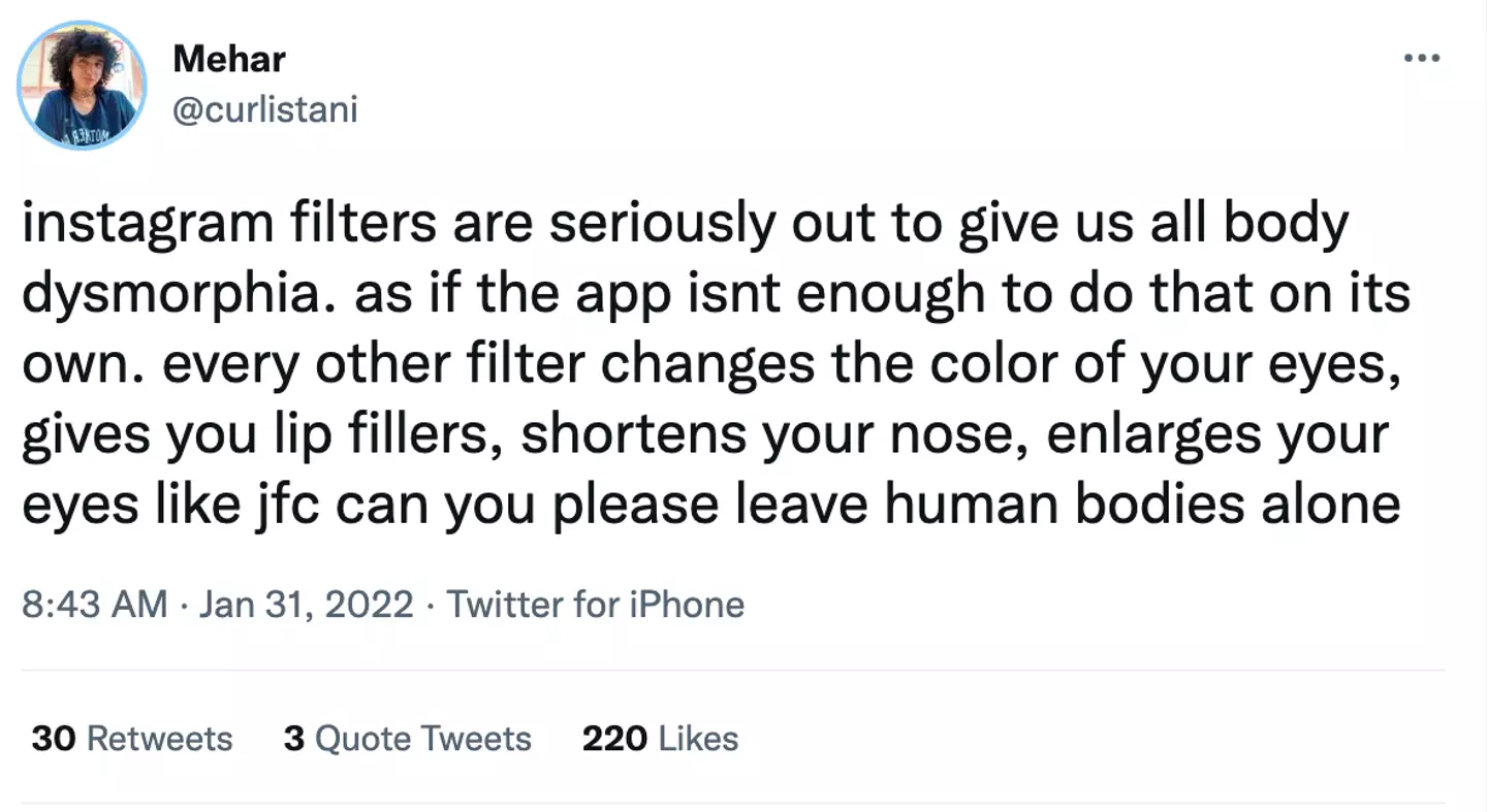 "If you are always showing yourself on social media with a particular filter, what happens when you meet those people in real life and you look different?"