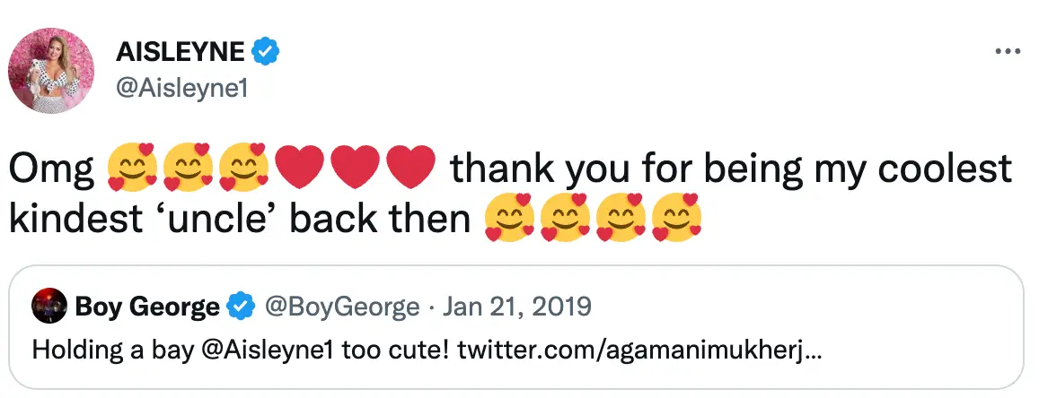 A few years back, Boy George shared a throwback photo of himself with baby Aisleyne to social media. Alongside the snap, he wrote: "Holding a bay @Aisleyne1 too cute!"