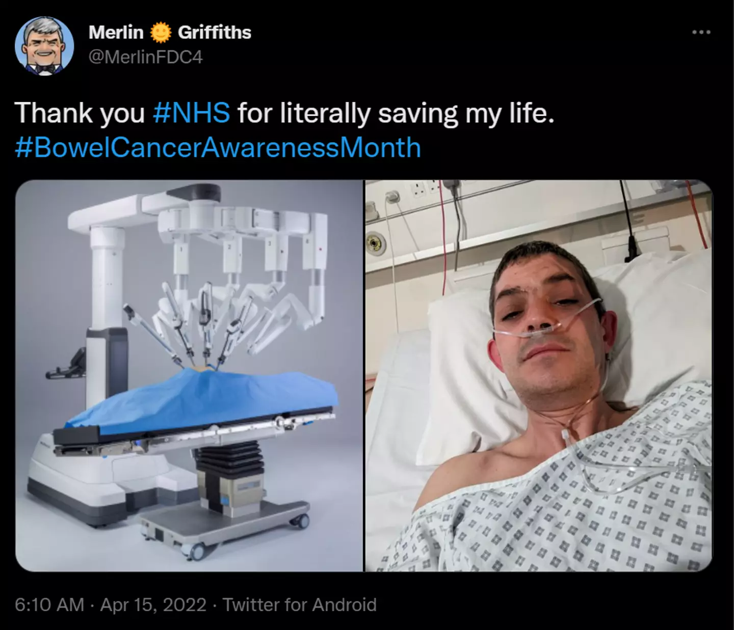 Since undergoing Merlin has also posted to Twitter to update fans and thank the NHS for "literally saving [his] life."