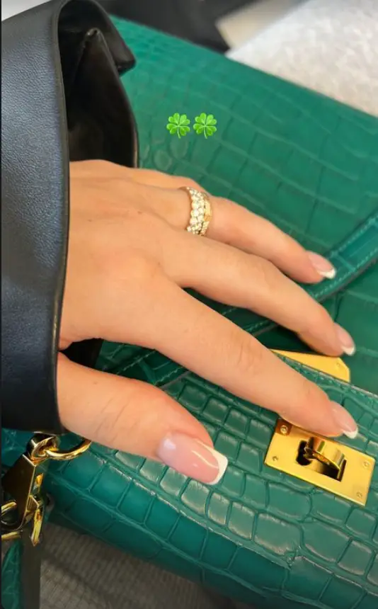 In a photo posted to her Instagram story Jenner can be seen posing with a green Hermes bag for St Patrick's Day, and fans were quick to point out that she seems to be wearing two diamond rings on her wedding finger.