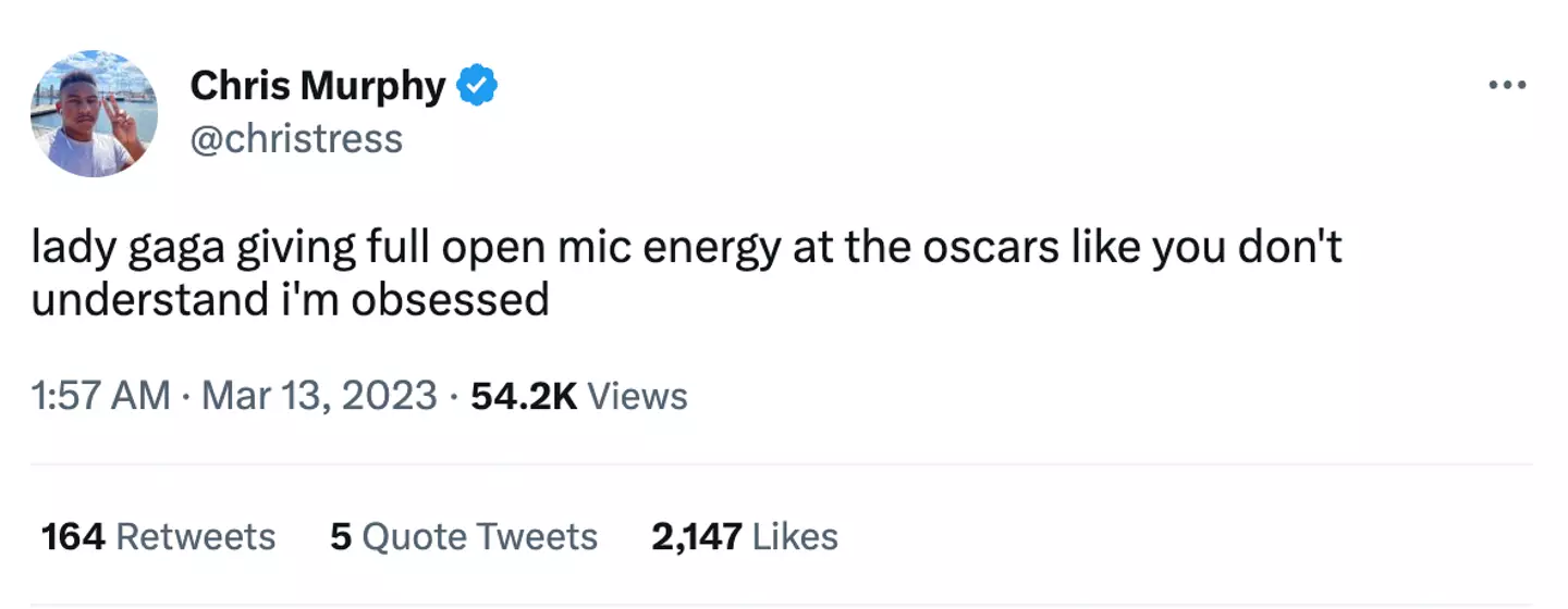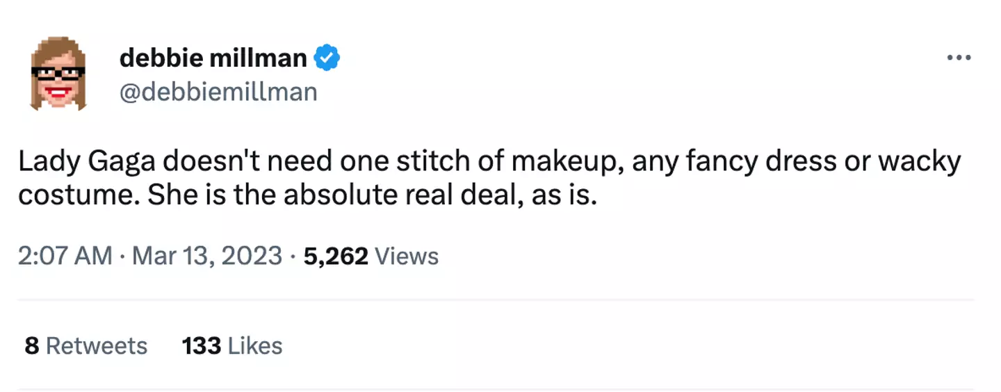 "I wonder how many people in the audience envied Lady Gaga for taking all the makeup, drip, and excess off for the performance and being so comfortable on stage," one person said.