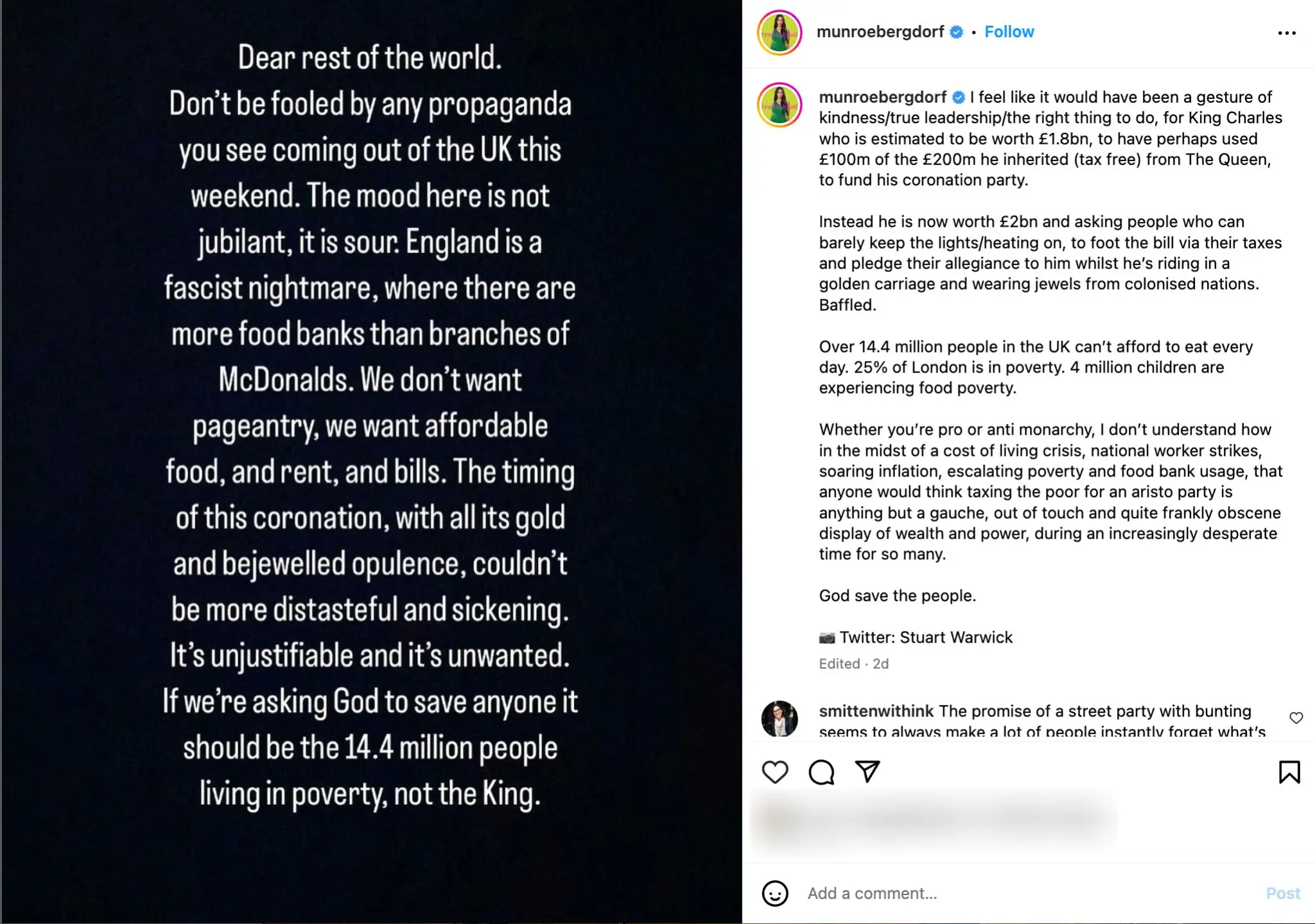 The caption continued: “Whether you’re pro or anti monarchy, I don’t understand how in the midst of a cost of living crisis, national worker strikes, soaring inflation, escalating poverty and food bank usage, that anyone would think taxing the poor for an aristo party is anything but a gauche, out of touch and quite frankly obscene display of wealth and power, during an increasingly desperate time for so many.