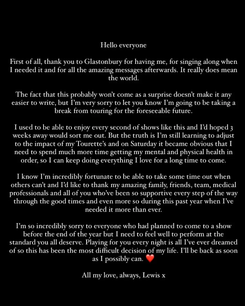 Lewis Capaldi has announced he is taking a break from touring for the 'forseeable future', following his Glastonbury set this weekend.