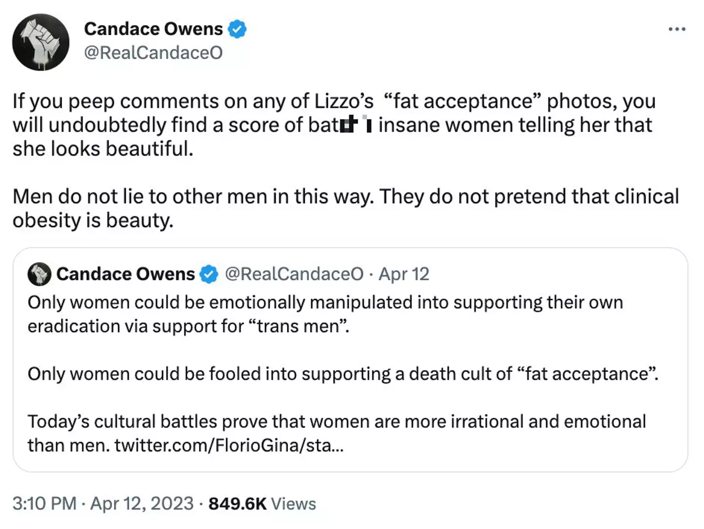 "Only women could be fooled into supporting a death cult of 'fat acceptance'. Today’s cultural battles prove that women are more irrational and emotional than men.”