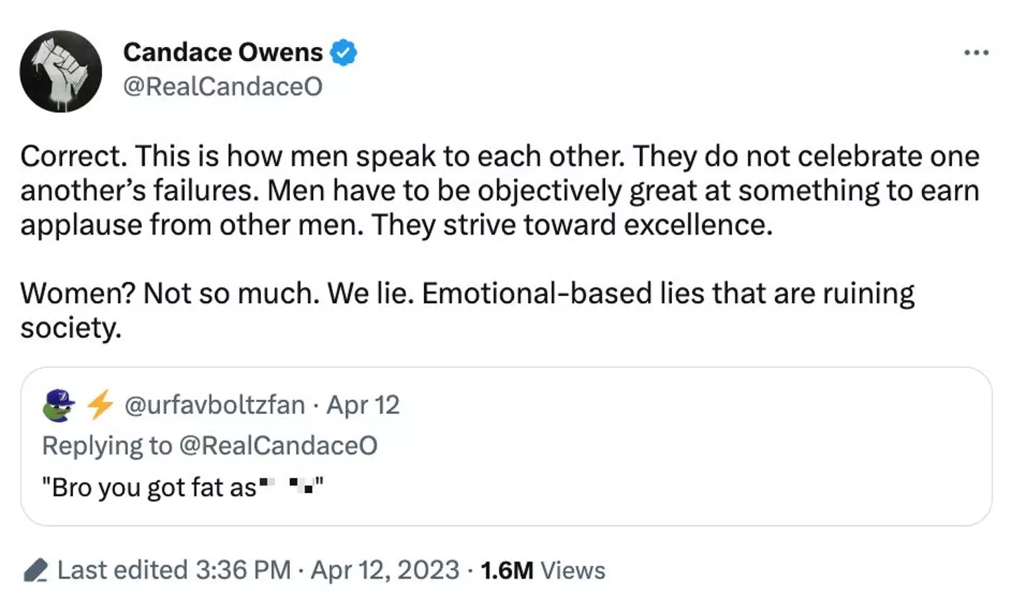 She wrote: “Correct. This is how men speak to each other. They do not celebrate one another’s failures. Men have to be objectively great at something to earn applause from other men. They strive toward excellence.