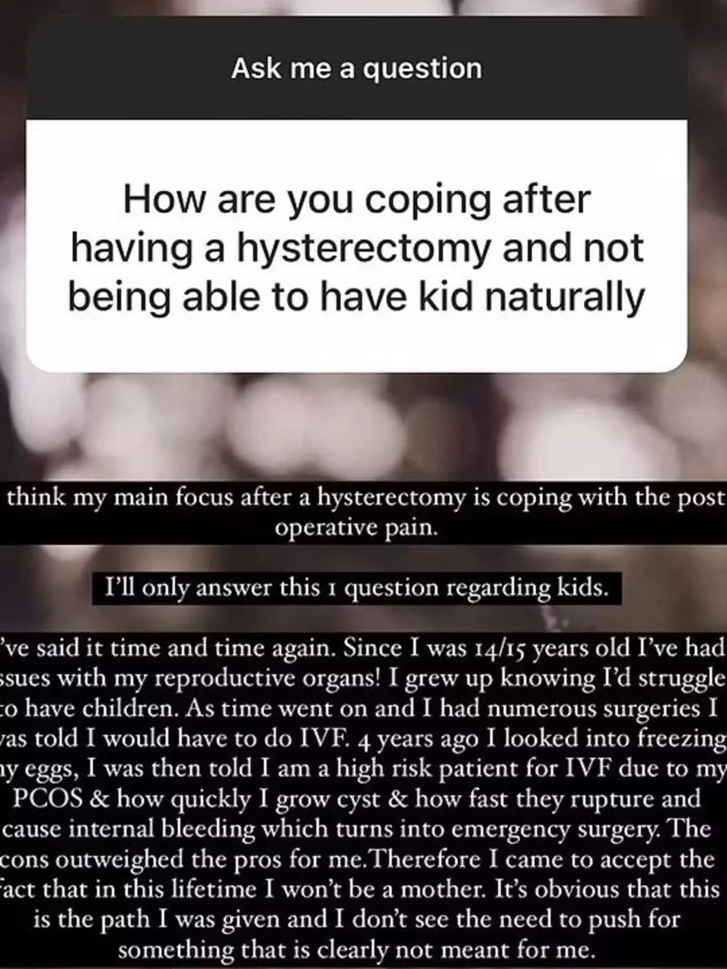 She held a Q&A with fans on her Instagram Stories, where one asked how she was ‘coping’ after the hysterectomy and ‘not being able to have a kid naturally’.