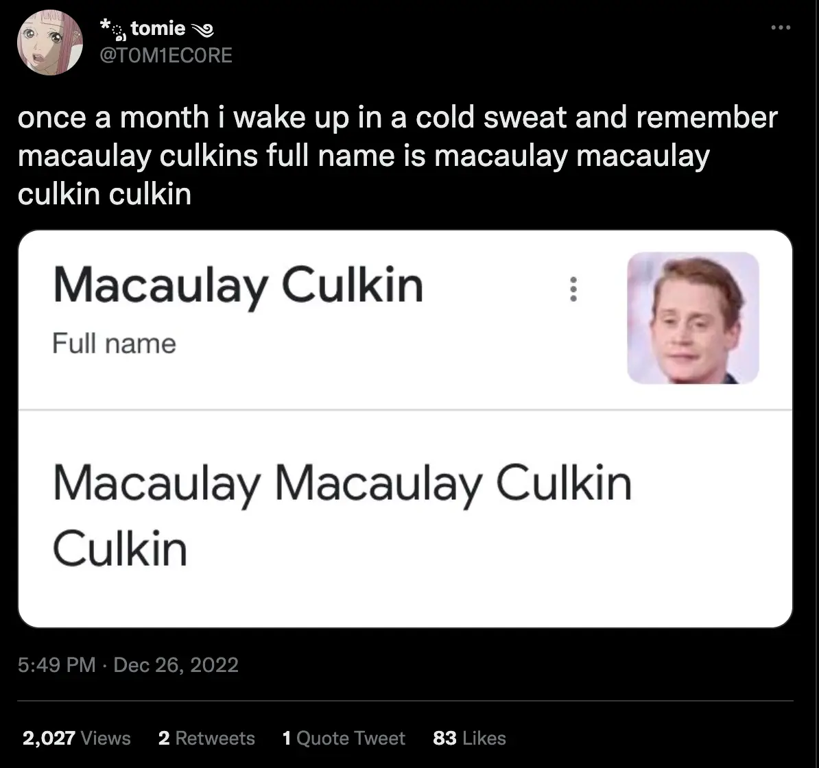 They wrote: "Odd things I learned this Christmas. (a) Macaulay Carson Culkin, aka Kevin-alone-at-home, is now 42 years old and changed his middle name to Macaulay Culkin, so his legal name is now Macaulay Macaulay Culkin Culkin."