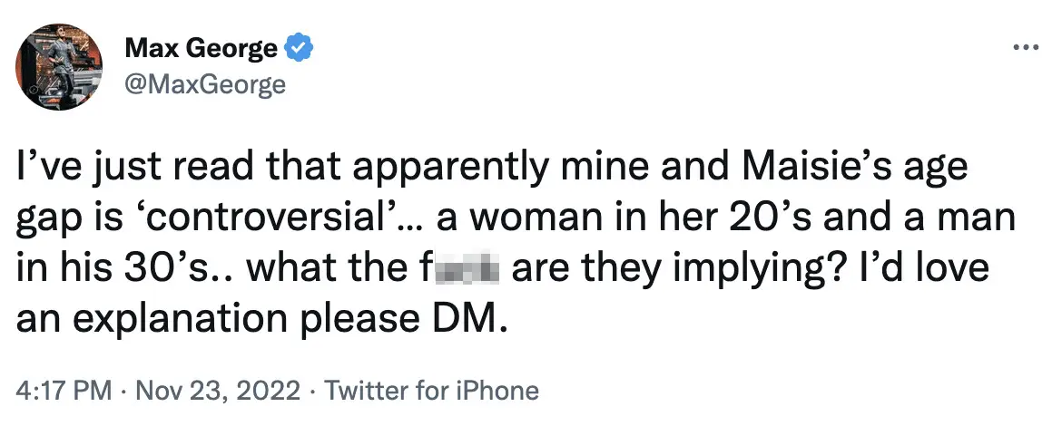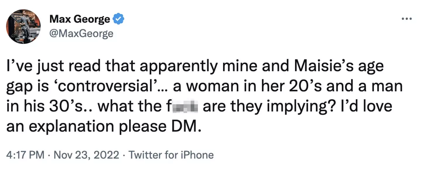 Responding to the online fallout, he tweeted: “I’ve just read that apparently mine and Maisie’s age gap is ‘controversial’… a woman in her 20’s and a man in his 30’s...