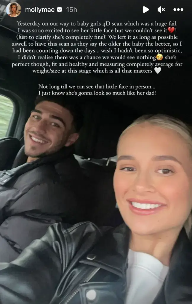 “Yesterday on our way to baby girls 4D scan which was a huge fail. I was sooo excited to see her little face but we couldn't see it,” she wrote on Instagram, alongside a heartbroken emoji.