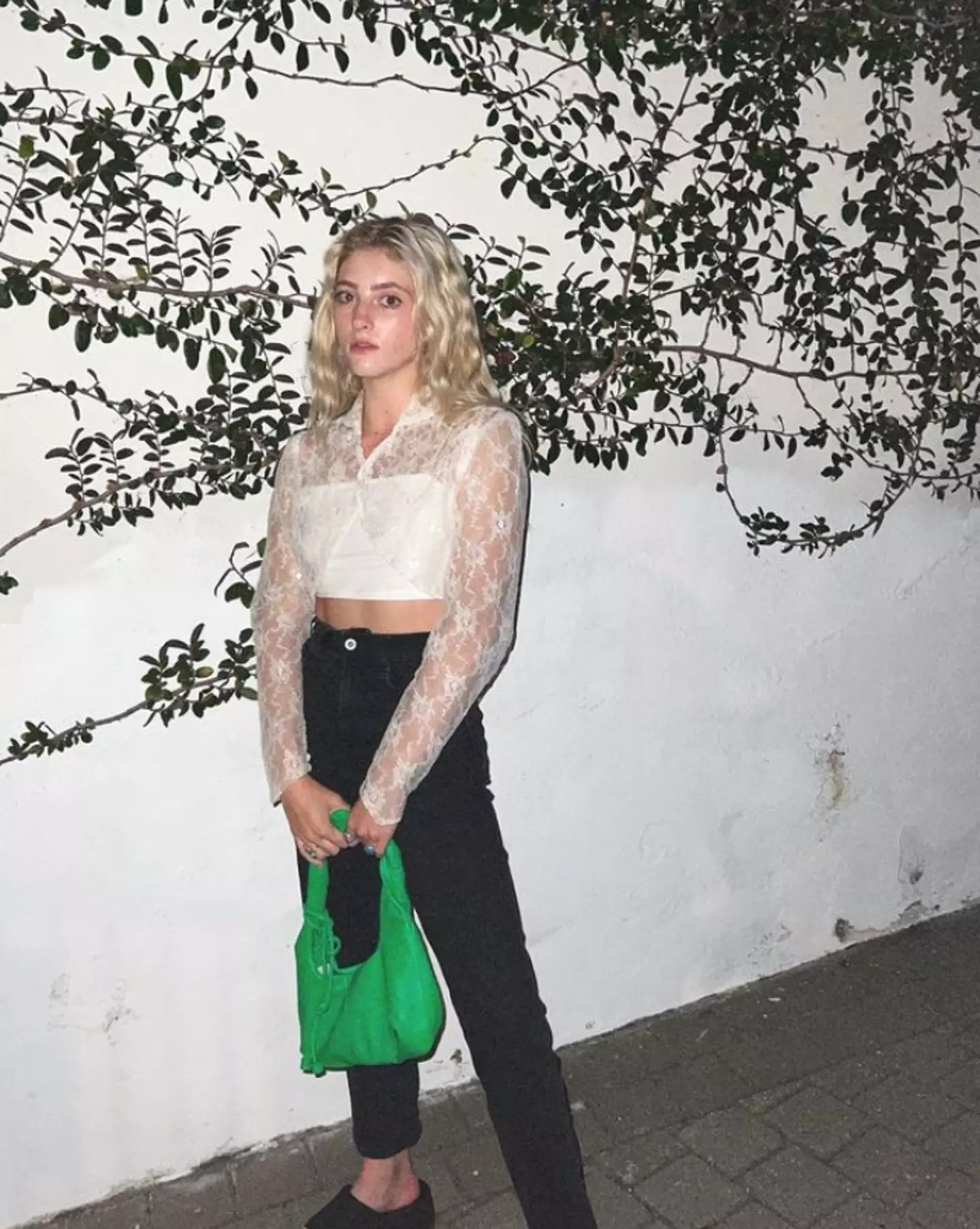 In the photo, Willow can be seen standing naked in front of a mirror with one arm covering her chest.