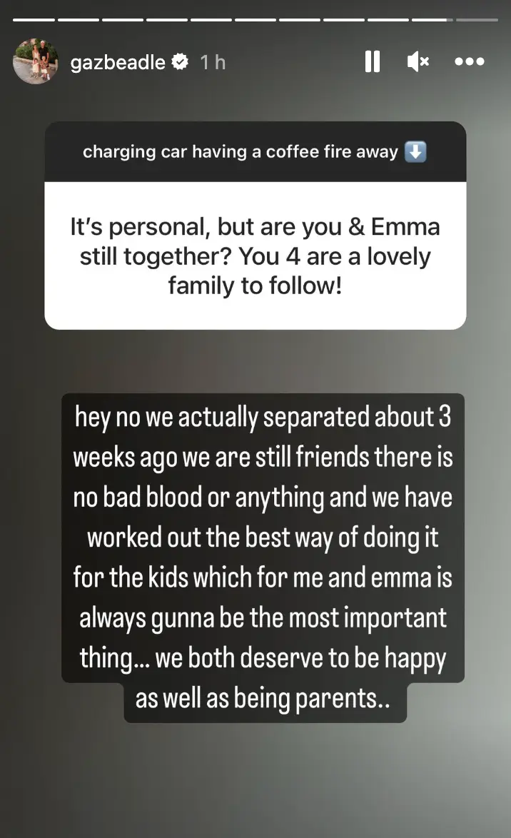 Gaz, who shares two children with Emma - Chester and Primrose - announced the news on Instagram during a Q&A with fans, saying there was no 'bad blood' but that the two parents both 'deserve to be happy'.