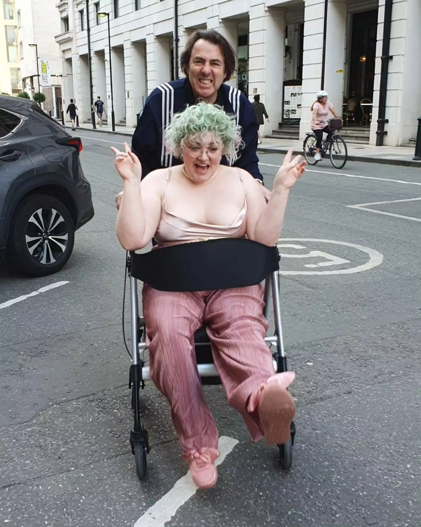In one snap, she could be seen being pushed along the road in her wheeled walker by dad Jonathan.