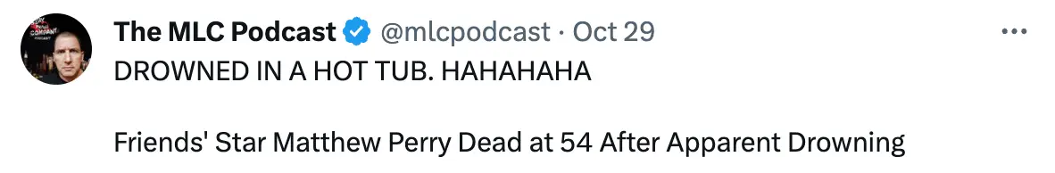 Sharing a news story that claimed he ‘mocked’ Perry’s death, the comedian wrote: “I didn’t mock it. I just thought it was funny. But I do love it when junkies die.”