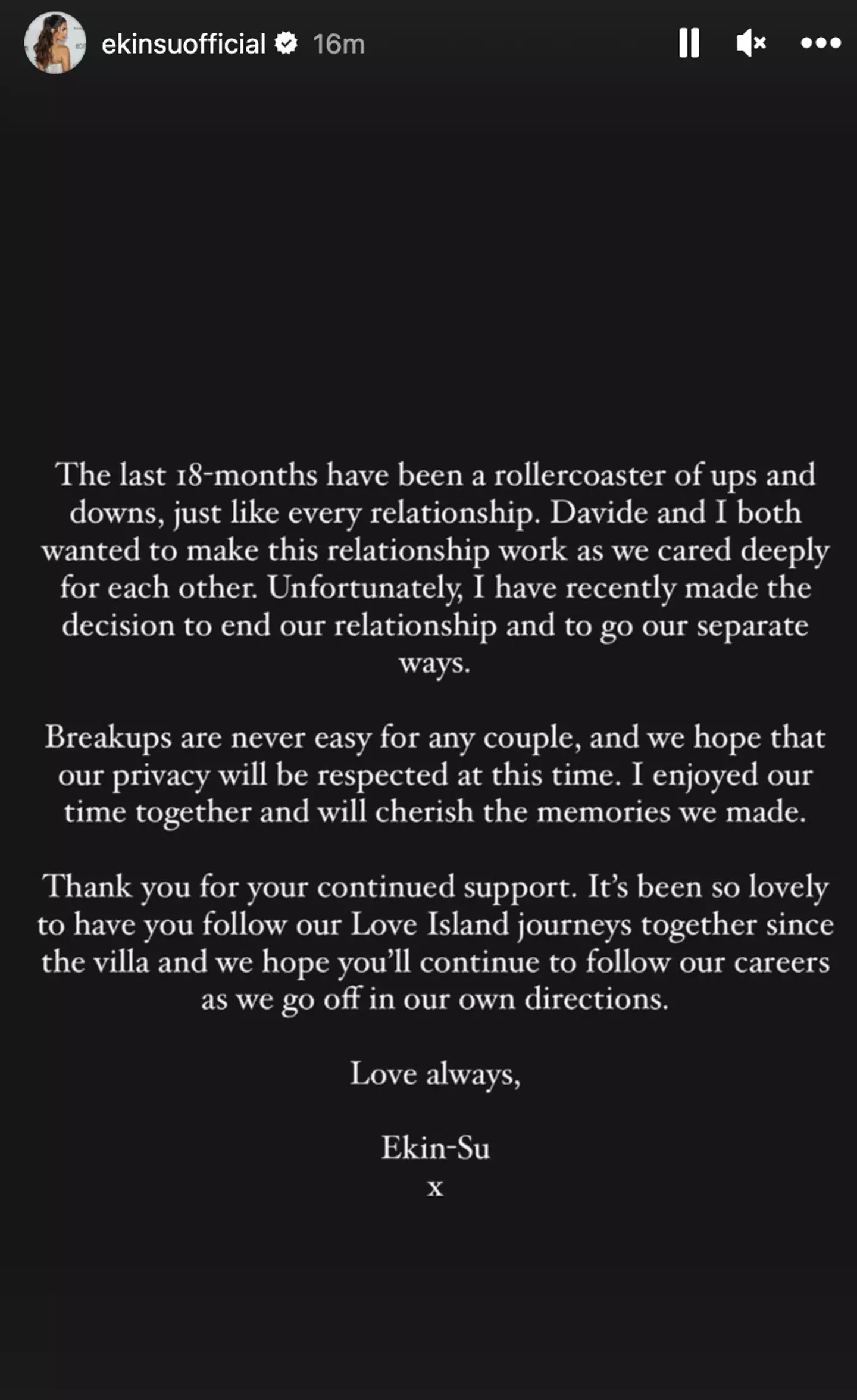 "Thank you for your continued support. It's been so lovely to have you follow our Love Island journeys together since the villa and we hope you'll continue to follow our careers as we go off in our own directions."