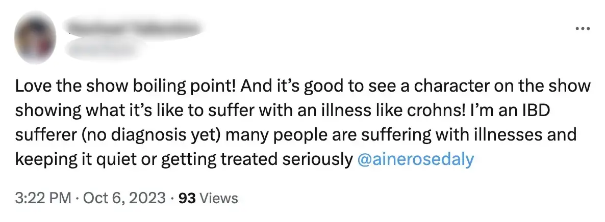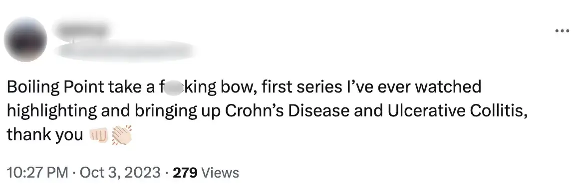 One X, formerly Twitter, user penned: "Congratulations to everyone involved in the Boiling Point mini series and the portrayal of a young woman suffering with Crohn’s Disease.