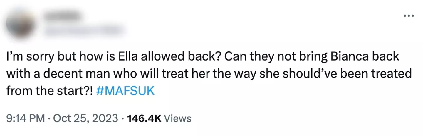 Many have taken to X, formerly Twitter, to voice their verdict, with one hitting out: "I’m sorry but how is Ella allowed back? Can they not bring Bianca back with a decent man who will treat her the way she should’ve been treated from the start?!"