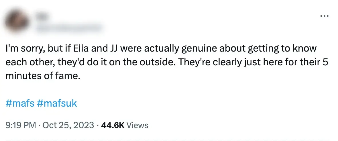 A second claimed: "I'm sorry, but if Ella and JJ were actually genuine about getting to know each other, they'd do it on the outside.