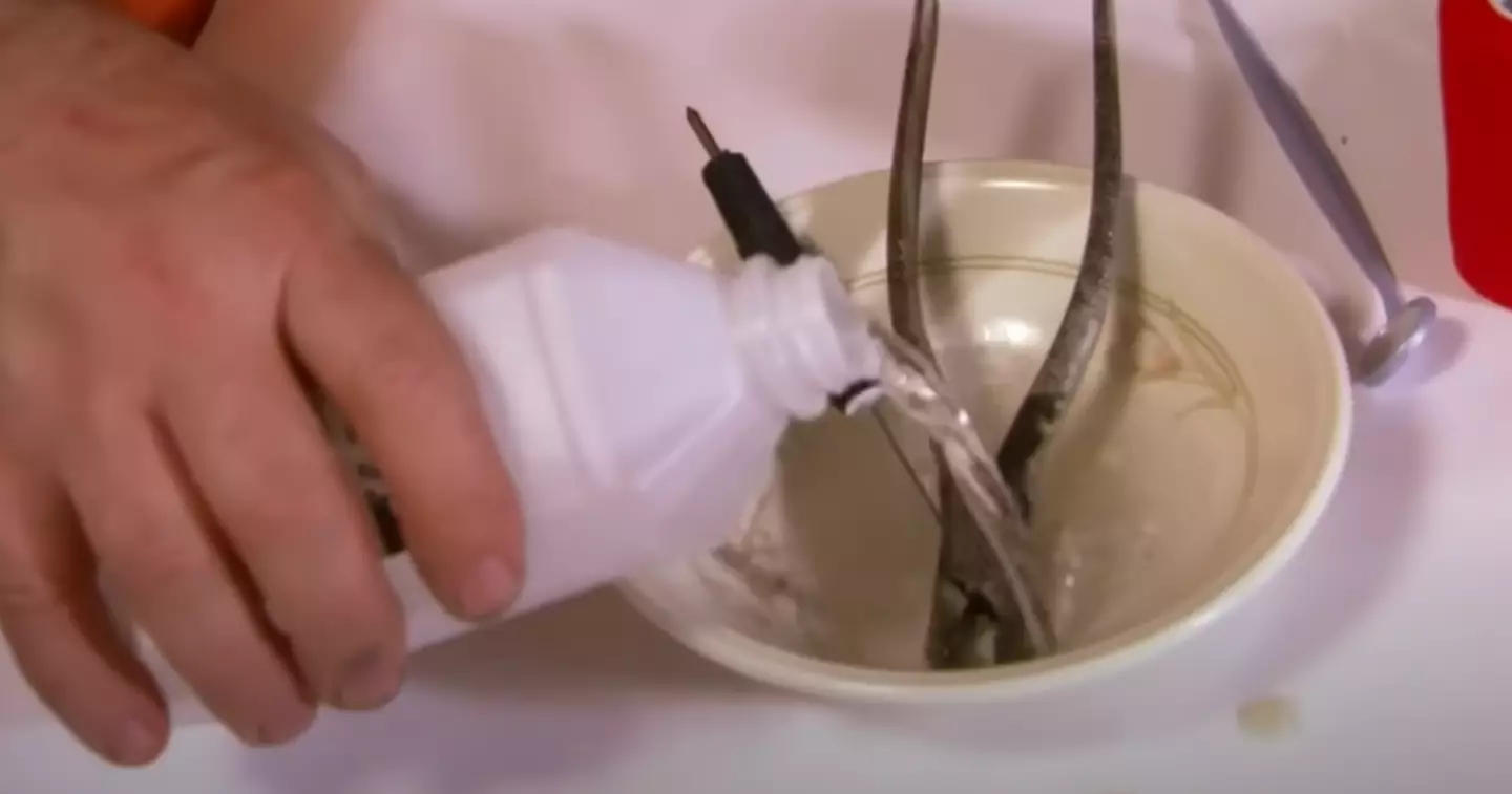 The couple also created a dentist suction tool – well, of sorts – out of their vacuum cleaner and a straw, while Grant dissolved the rust on the metal tongs using cola, also putting them in rubbing alcohol to sterilise them.