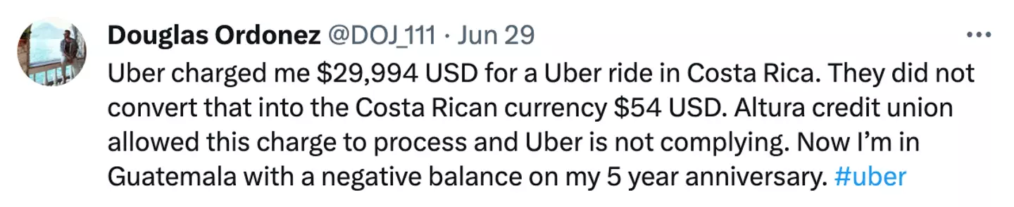 Douglas took to Twitter last week (29 June), writing: "Uber charged me $29,994 USD for a Uber ride in Costa Rica.