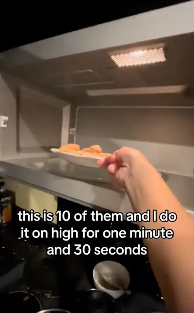 If she’s preparing 10 nuggets, Se microwaves them on high for one minute and 30 seconds – though as with all reheated food, make sure yours is PIPING hot before you eat; a safer way would be to let the nuggets fully defrost in the refrigerator before heating them up in the microwave.