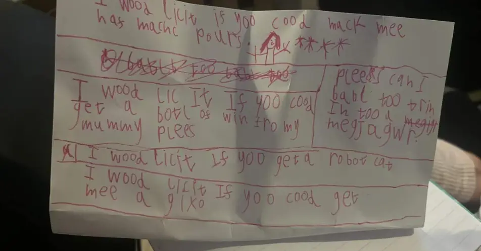 Then, there's a polite request for a robot cat and a jigsaw (spelt 'gixo'), but things get a little bit harder to make out after that.
