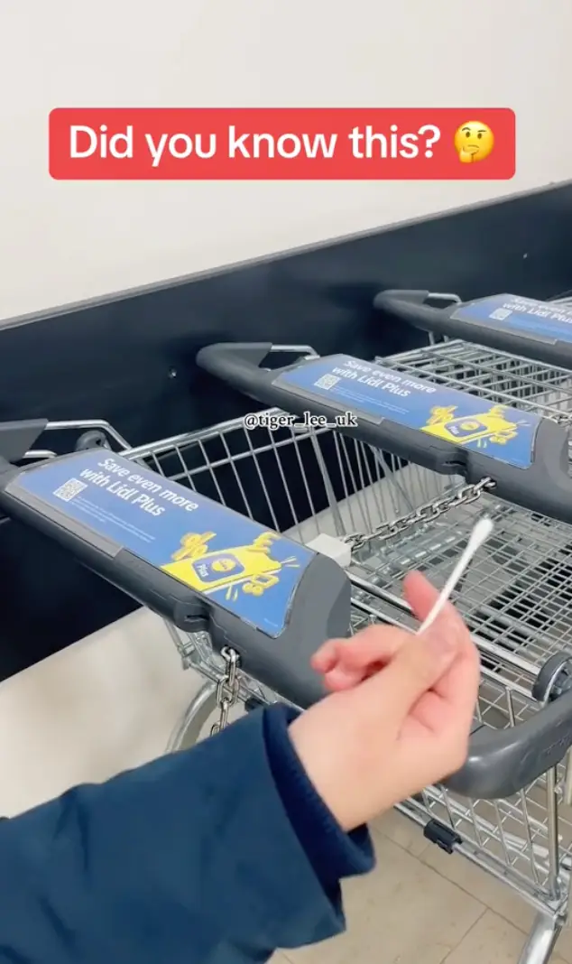The trick in question saw the woman use two alternative items to release the trolley - the first of which being a Q-tip AKA cotton bud.