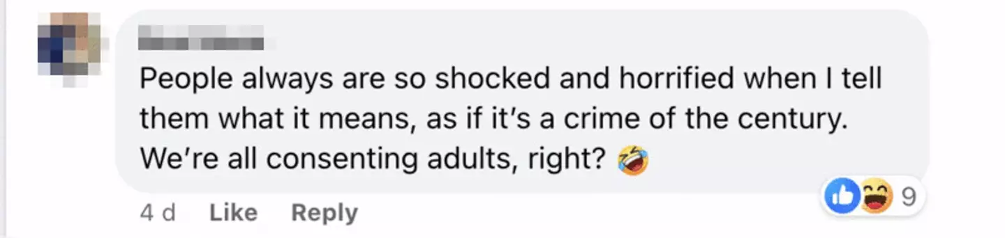 Another added: “People always are so shocked and horrified when I tell them what it means, as if it’s a crime of the century. We’re all consenting adults, right?”