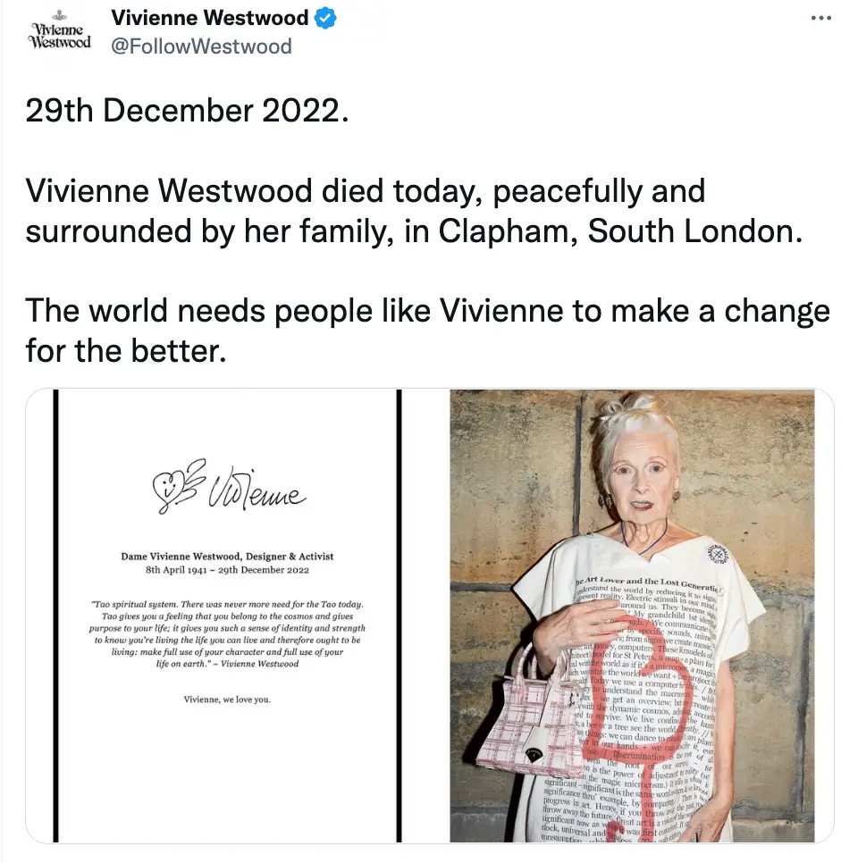 The statement read: “Vivienne Westwood died today, peacefully and surrounded by her family, in Clapham, South London. The world needs people like Vivienne to make a change for the better.”