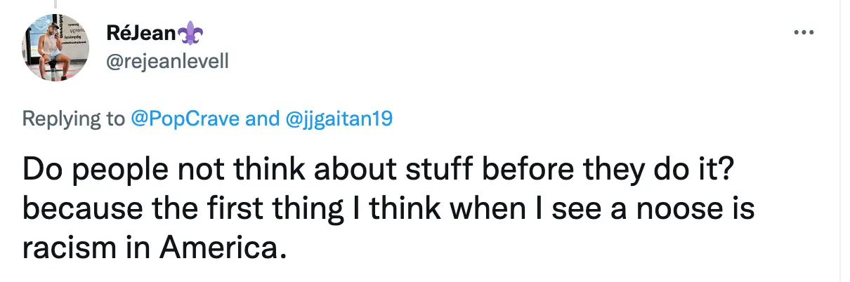 A third person replied: "Do people not think about stuff before they do it? because the first thing I think when I see a noose is racism in America."
