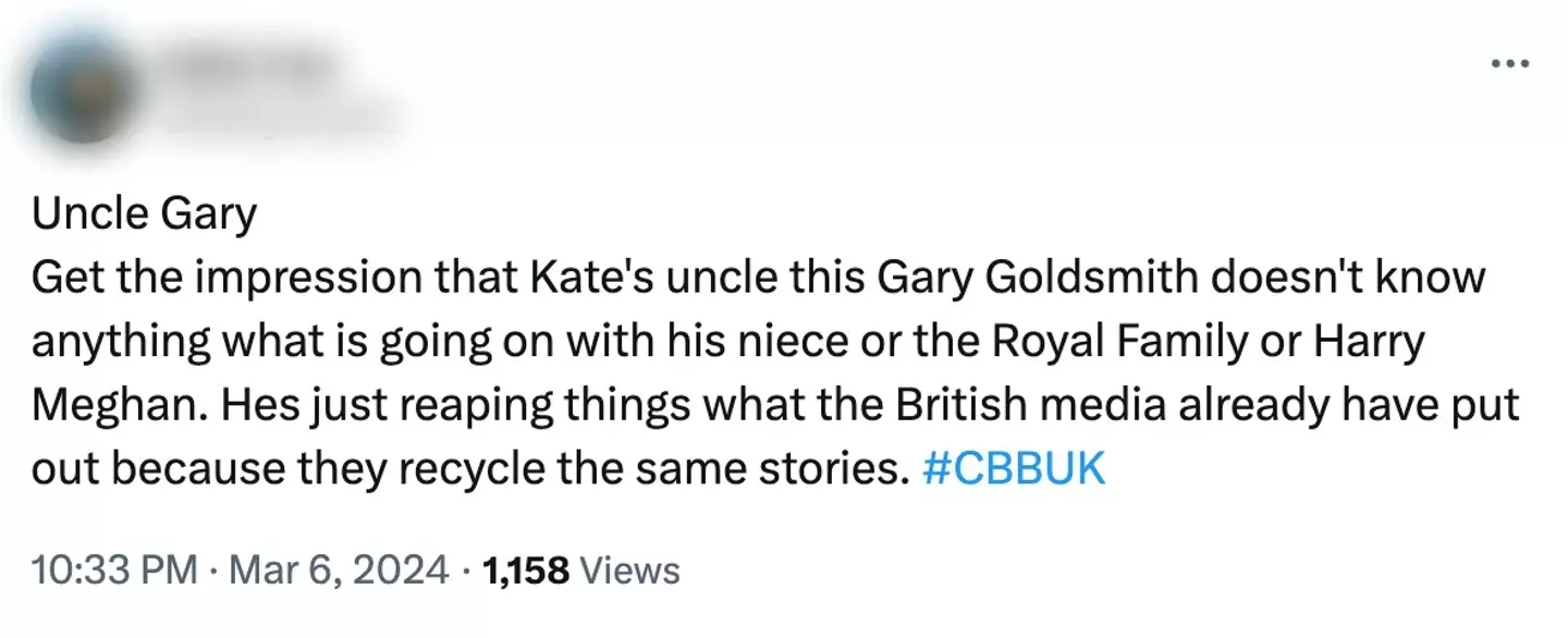 More responses flooded in, with a third adding: “Get the impression that Kate's uncle this Gary Goldsmith doesn't know anything what is going on with his niece or the Royal Family or Harry and Meghan. He's just reaping things what the British media already have put out because they recycle the same stories.”