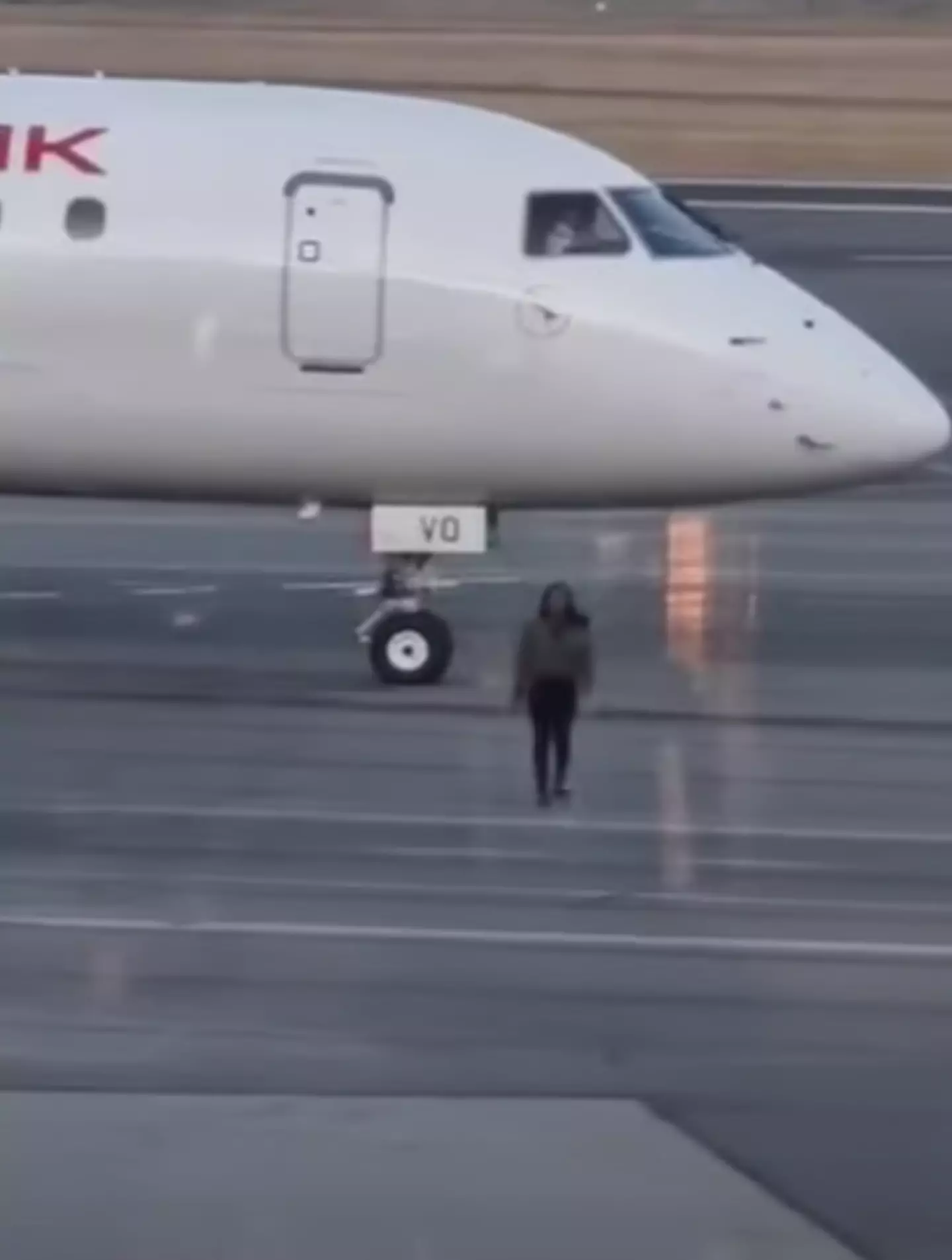 Footage captures the shocking moment a woman who missed her flight ran onto the tarmac in a desperate bid to catch her plane.
