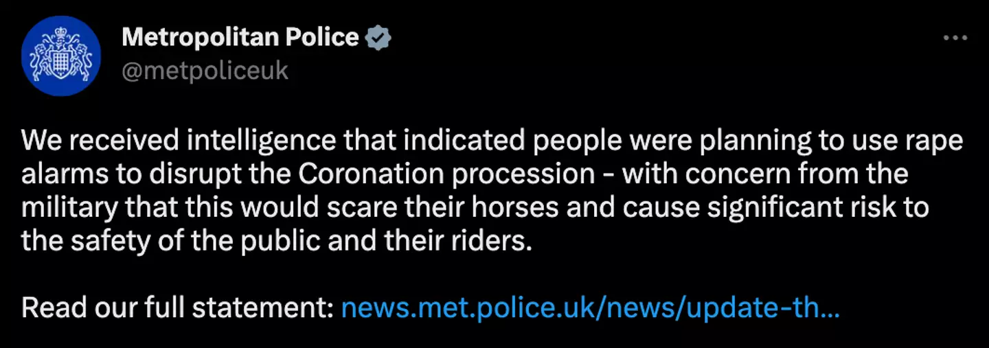 Metropolitan Police said they have 'received intelligence yesterday (5 May) that indicated groups and individuals seeking to disrupt today’s Coronation proceedings'.