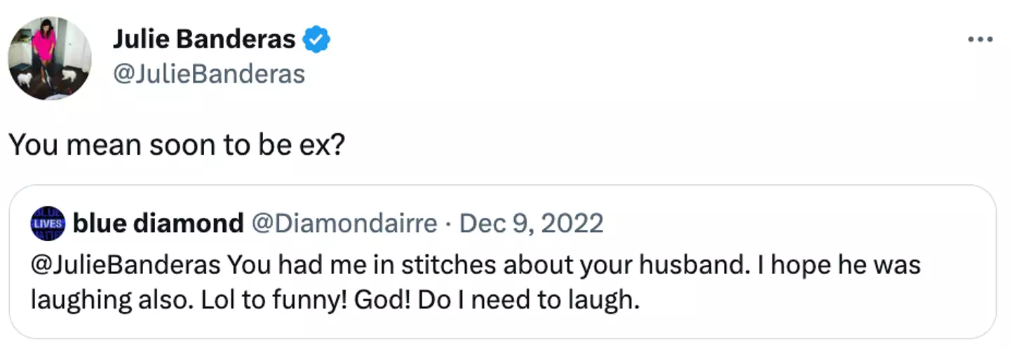 The tweet read: “You had me in stitches about your husband. I hope he was laughing also. Lol to funny! God! Do I need to laugh.”