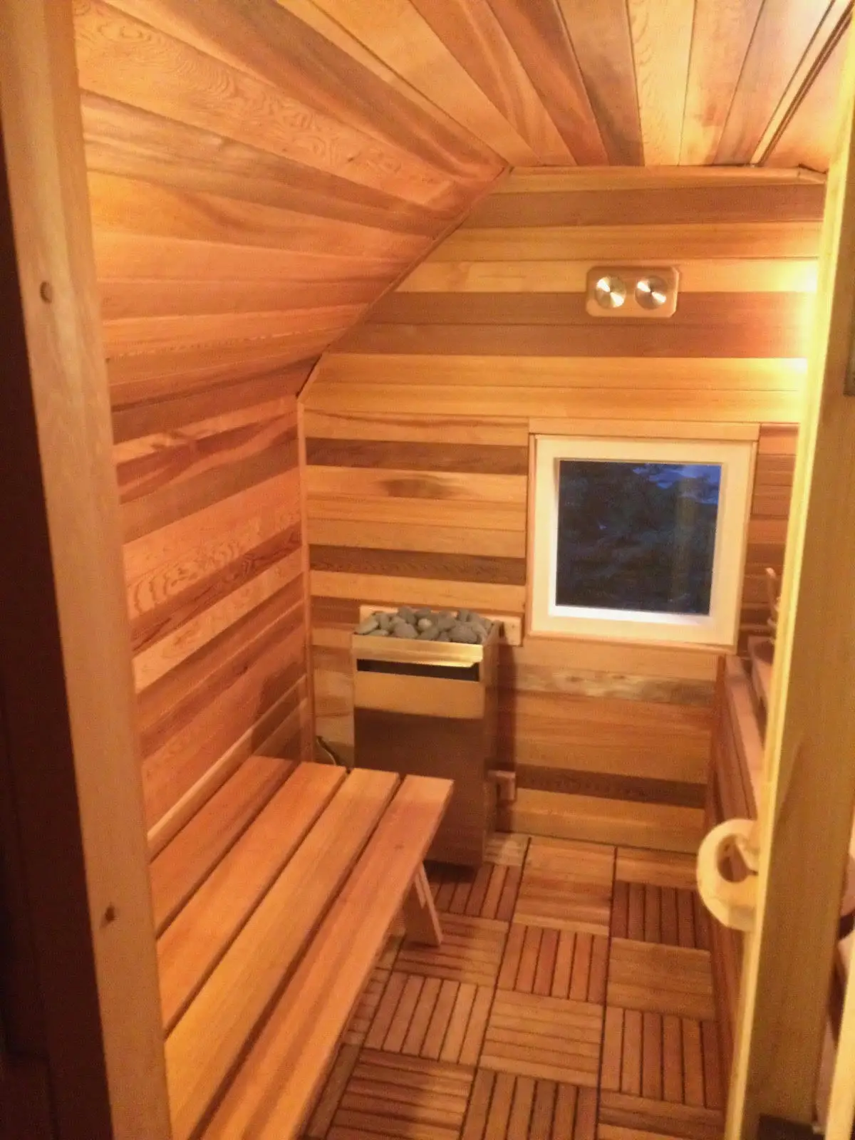 “After that, we installed insulation, flooring, drywalls and wood panels for the walls in the spa and sauna.