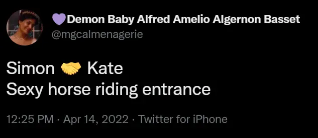Posting to Twitter, they shared a similarity between the introductions of season one's love interest Simon Basset, and the love interest of season two Kate Sharma.