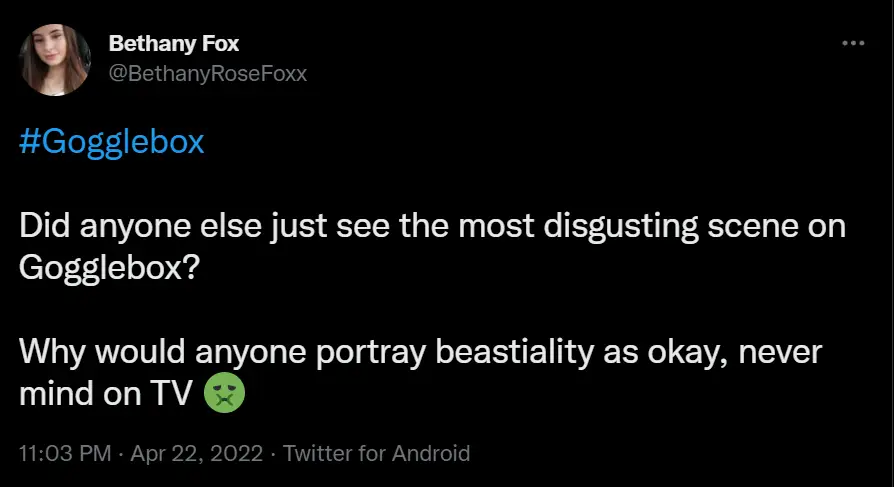 "#Gogglebox should not be promoting shows that are basically insinuating bestiality. That was absolutely disgusting and wasn’t in the slightest bit funny." Added a second.