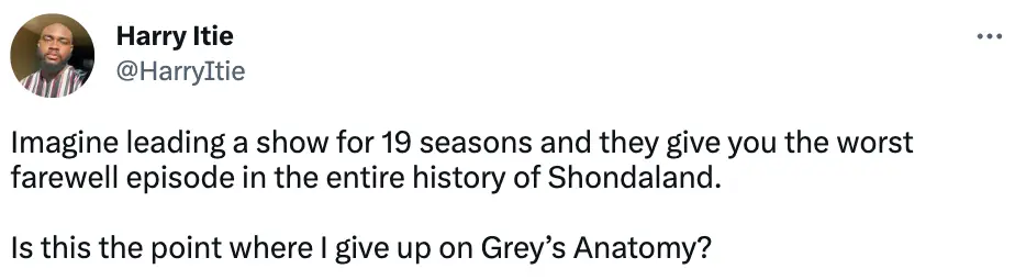 A third fan implied they’re considering giving up on watching the show. “Imagine leading a show for 19 seasons and they give you the worst farewell episode in the entire history of Shondaland,” they said.