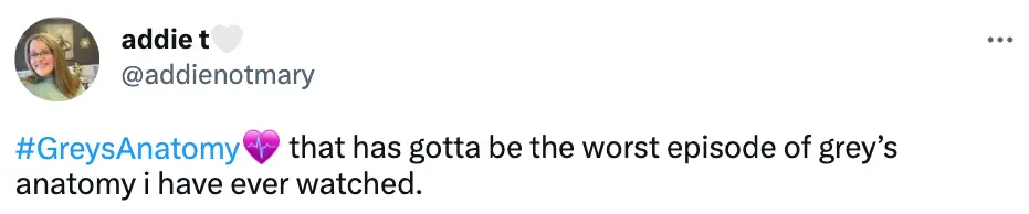 A fourth tweeted: “That has gotta be the worst episode of Grey’s Anatomy I have ever watched.”