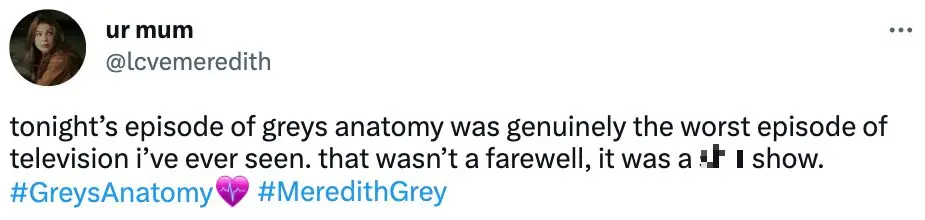 “Tonight’s episode of Grey's Anatomy was genuinely the worst episode of television I’ve ever seen. that wasn’t a farewell, it was a sh*t show," one social media user declared.
