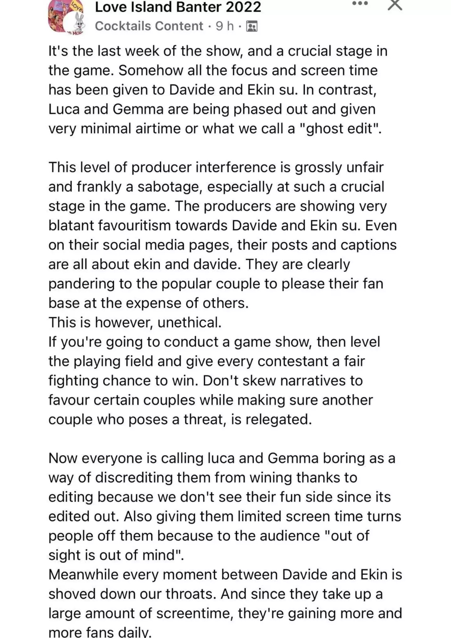They complained: "It's the last week of the show, and a crucial stage in the game. Somehow all the focus and screen time has been given to Davide and Ekin Su. In contrast, Luca and Gemma are being phased out and given very minimal airtime or what we call a 'ghost edit.'