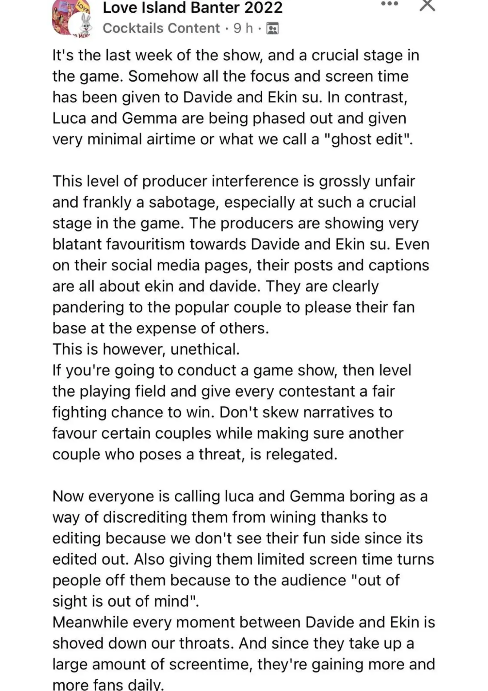 "This level of producer interference is grossly unfair and frankly sabotage, especially at such a crucial stage in the game. The producers are showing very blatant favouritism towards Davide and Ekin Su. Even on their social media pages, their posts and captions are all about Ekin and Davide."