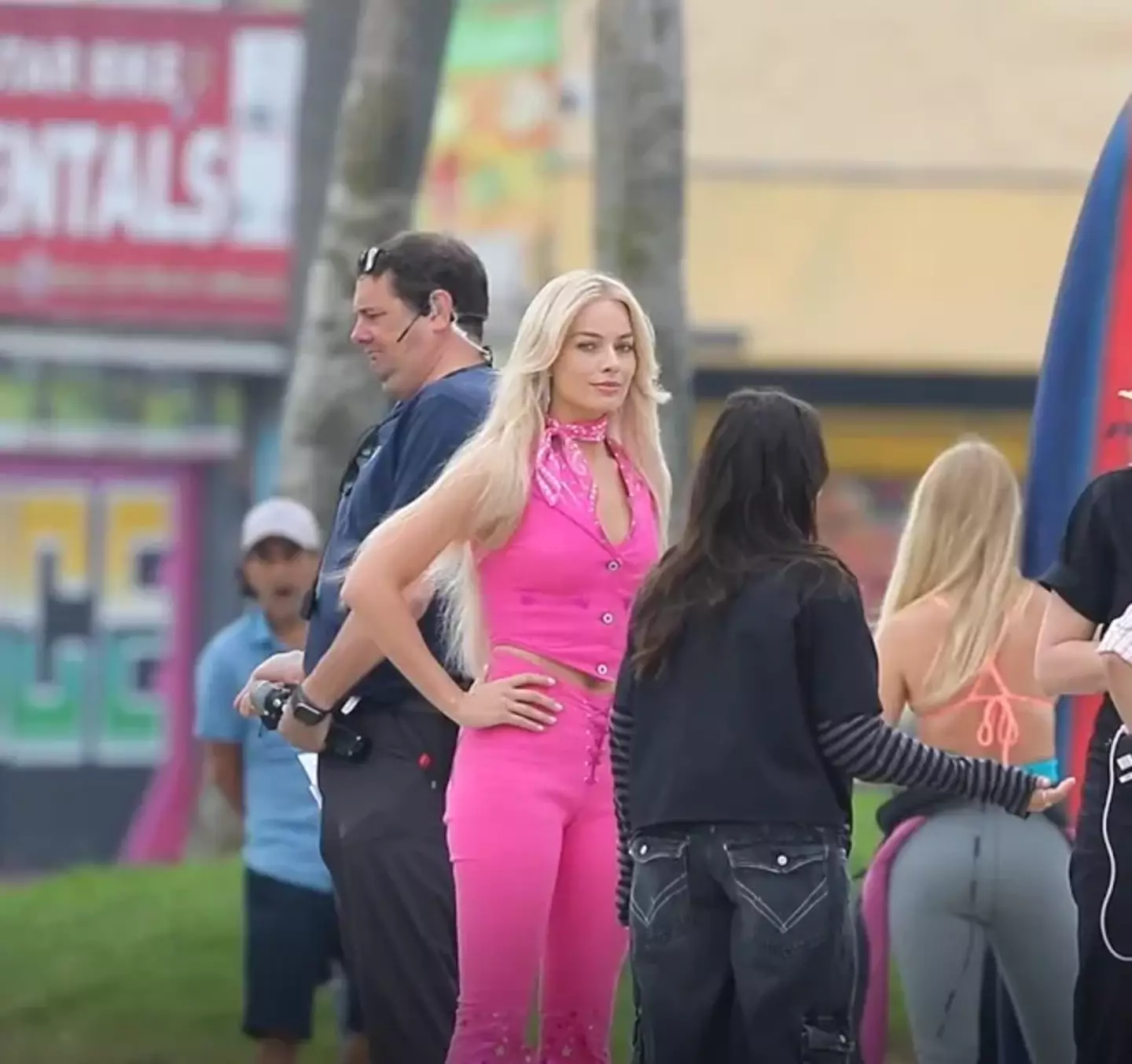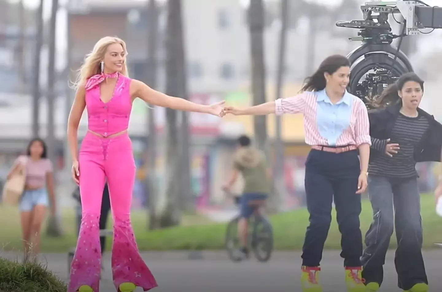 The 31-year-old was spotted shooting the highly-anticipated flick, which is directed by Greta Gerwig, in Venice Beach alongside her co-star America Ferrera.