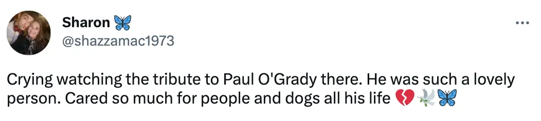 A third fan shared: “Crying watching the tribute to Paul O'Grady there. He was such a lovely person. Cared so much for people and dogs all his life.”