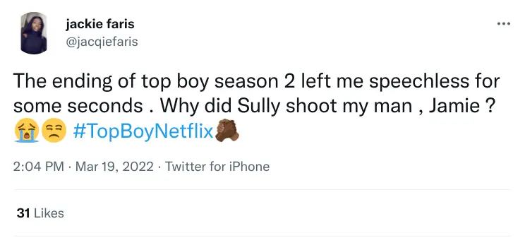 Wither others simply just tweeted: "I'm disappointed #TopBoyNetflix" and "Disappointed with the end of #Topboy #TopBoyNetflix"